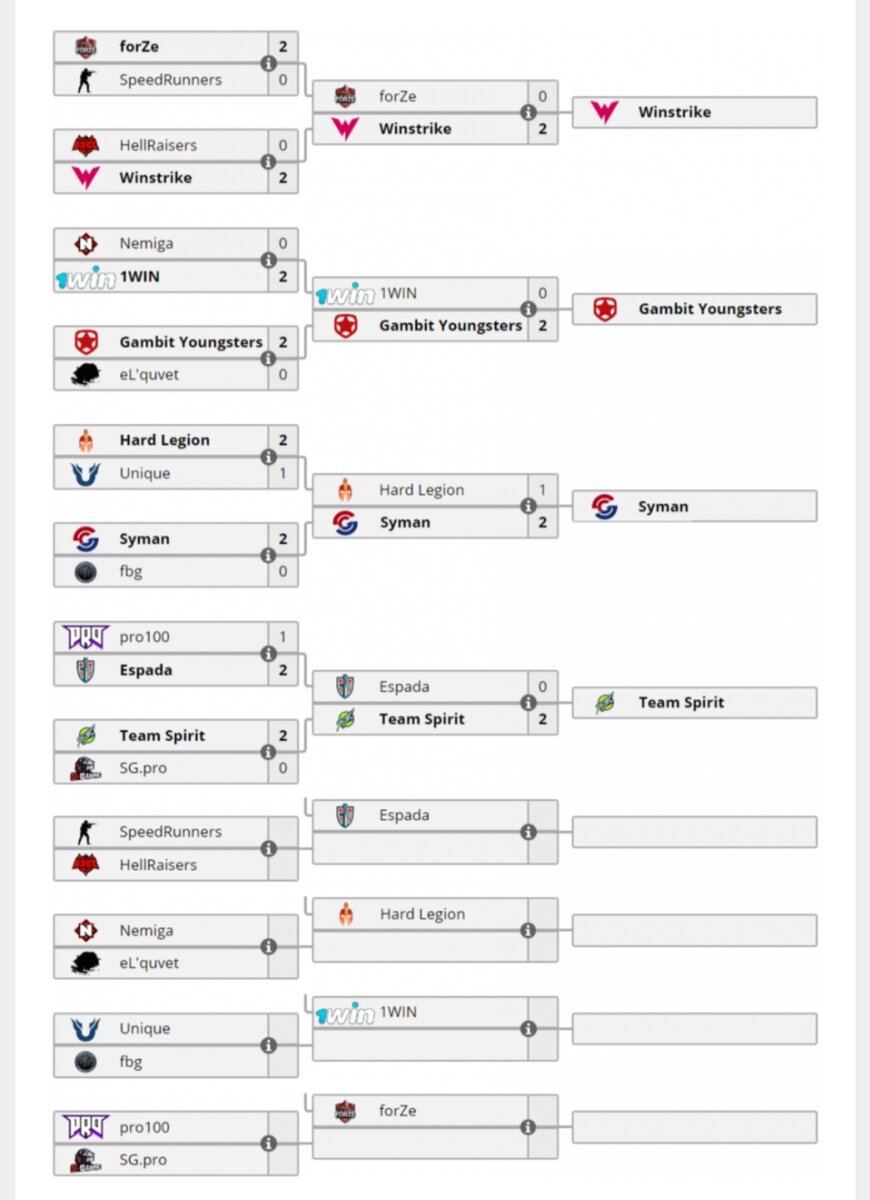 Завершился первый игровой день закрытого этапа квалификации к CIS Minor – Rio 2020, который преподнес как уверенные победы фаворитов в лице Winstrike, Gambit Youngsters, Syman и Team Spirit, так и несколько неожиданных результатов. Одна на из самых опытных команд в СНГ nemiga без шансов проиграла 1WIN, которые становятся фаворитами в борьбе за квоту в нижней сетке. Если завтра игра белорусов не поменяется, то нас ждет очередной провал этой команды на пути к главному турниру сезона. forZe являлись главными фаворитами всего цикла CIS Minor – Rio 2020, но сейчас, очевидно, коллектив находится в небольшом спаде игровой формы: в конце февраля безуспешно выступают на DH Open в Анахайме, неделю назад терпят поражение от Team Spirit на WESG 2019-2020 Russia Finals, а теперь находятся в шаге от вылета, проигрывая Winstrike, которые проводят свой первый крупный турнир под руководством Дмитрия "hooch" Богданова в роли главного тренера. Главный андердог турнира Espada прошли pro100 и на равных б