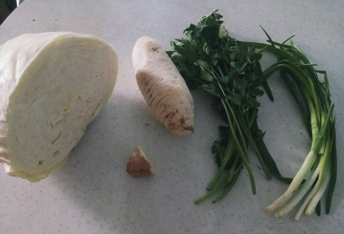В простудный период, да и не только, лучше всего включать в свой рацион продукты, поднимающие иммунитет. Одним из таких является имбирь. Но в чистом виде вряд ли кто будет кушать имбирь, а вот в составе салата он очень даже неплохо заходит. Кроме того, для поднятия иммунитета в салат можно добавить дайкон. Это тоже отличный стимулятор иммунной системы растительного происхождения. Многие и не знают что такое дайкон. А это овощ белого цвета, который по форме похож на репу или морковь (в зависимости от сорта). А по вкусу напоминает редис, но менее резкий. Впрочем, этот овощ надо попробовать каждому лично. Возможно у кого-то будут совсем другие вкусовые ассоциации с ним. Сделать это легко, потому что продается дайкон практически в каждом овощном отделе крупных супермаркетов. Остальные ингредиенты (лук, петрушка и капуста) не менее полезны. Просто салаты из них уже стали чем-то обыденным. Только поэтому акцент сделан на имбире и дайконе. Но в целом каждый ингредиент данного салата - просто