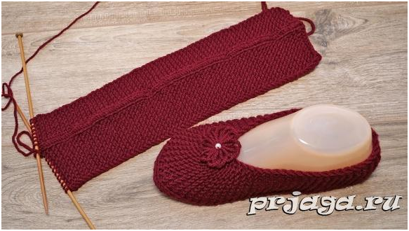 Самое простое вязание тапочек, которое я видела. Сама ещё не вязала, но очень хочу попробовать. Но пока предлагаю Вам. Тапочки вяжутся на 2-х спицах. На размер 36 петель набираем 20. 1ряд – лицевая сторона : 1кром* 18 лиц* 1кром. 2 ряд – изнаночная сторона: 1кром*10 лиц*2изн*6 лиц*1кром. С 3 по 130 ряды повторяем 1-2 ряд. Длина 37 см. Закрываем петли- провязываем 2 п. вместе, которая петля получилась, возвращаем обратно и опять провязываем 2 п. вместе и так далее. Сшиваем с двух сторон, пришиваем цветочек. Получилось модно и красиво. Увидела ещё один вариант вязания простых тапочек. Их вяжем из пряжи 2-х цветов. Берем кремовую пряжу, начинаем вязать: набираем 5 петель 1 ряд – лицевая сторона 1кром*3лиц*1кром 2 ряд – изнаночная сторона 1 кром* 1лиц* прибавить петлю в право* 1лиц* прибавить петлю в лево* 1 лиц* 1кром. 3 ряд – 1 кром*5 лиц*1 кром. 4 ряд – 1 кром*1 лиц* прибавить петлю в право* 5 лиц* прибавить петлю влево*1 лиц* 1 кром. С 5 по 16 – ряды вяжем как 2-4 ряды. Всег