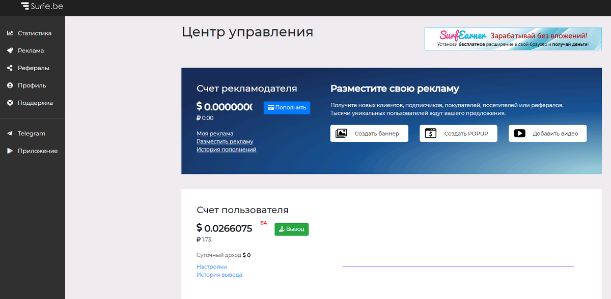 Добрый день дорогие подписчики. Хочу поделиться еще одним видом заработка, который подойдет всем кто днями сидит в интернете и пользуется браузером. Можно просто включить компьютер, открыть браузер и заниматься своими делами.... деньги все равно будут капать. (Отличный заработок для школьников, кто в декрете и всех кто хочет пассивно зарабатывать). Существует отличная программа surfe.be, которая устанавливается как расширение для браузера и зарабатывает деньги пока вы листаете страницы интернета. Также у программы имеется отличная реферальная программа, которая также позволяет зарабатывать без вашего участия. Единственное что от Вас требуется, это найти таких же заинтересованных людей как и вы. Смысл программы, после регистрации, вы устанавливаете специальное расширении и у Вас в правом углу браузера будет вот такой значок... Который самостоятельно показывает в углу рекламу и начисляет Вам деньги. Вывод денежных средств очень простой. Попробуйте и убедитесь сами. Ссылка на сайт surfe.