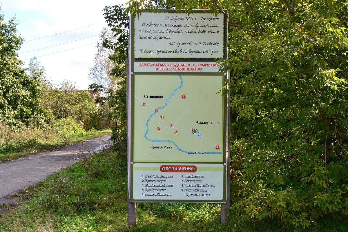 «Далее переход вдоль железной дороги до села Лукьянчиково. Проходим по ж/д мосту реку Оптуху, где в 19 веке произошло крушение поезда (по масштабу схожее с Кукуевской катастрофой). Вспомним его историю и поищем ракурс, с которого было сделано дореволюционное фото этого крушения. Доходим до усадьбы А.П.Ермолова в Лукьянчиково (план усадьбы прилагается ниже). Осмотр местности. В оставшееся до транспорта время традиционный привал и обед», –
