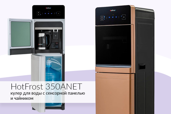 Уникальность кулера HotFrost 350 ANET выражается в легком управлении опциями сенсорной панелью, а термоэлектрическое охлаждение обеспечивает бесшумность работы системы. И самый необычный элемент кулера HotFrost 350 ANET – это маленький литровый чайник, которым мы традиционно привыкли пользоваться для заваривания.