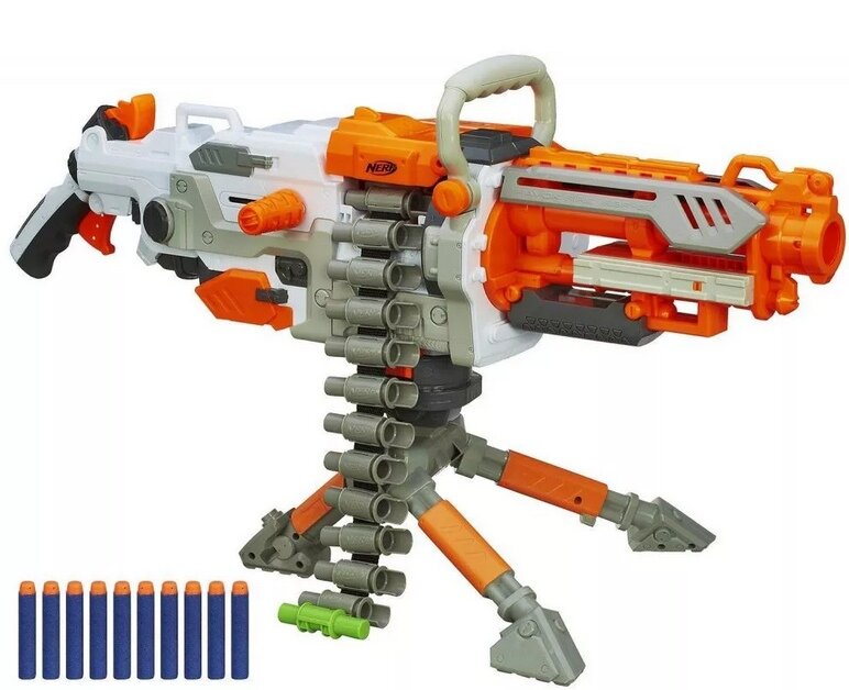 Нерф Элит Вулкан Прототипом этой модели стал настоящий авиационный пулемет Вулкан. Благодаря своей огневой мощи он способен с легкостью подавлять даже превосходящие силы противника. Скорострельность составляет 3 выстрела в секунду! Этот бластер (если конечно его можно так назвать) обладает кучей особенностей, которые делают его очень ценным и редким. К тому же он был снят с производства и купить его теперь еще сложнее. Приобрести его можно как новеньким так и б/у. Цена ~50 000руб. Боекомплект — первое что бросается в глаза. Стрелы необходимо загружать в пулеметную ленту на 25 патронов. Как написано на пачке: дальность стрельбы составляет 18-20 метров. Этот бластер также отличается высокой точностью. Интересный факт: этот бластер считается самым первым полностью автоматическим бластером. Для того, что-бы начать стрелять надо всего лишь нажать на спусковой крючок. Питание бластера осуществляется от 6 больших батареек LR 20 (НЕТ В КОМПЛЕКТЕ). Также этот пулемет можно перек