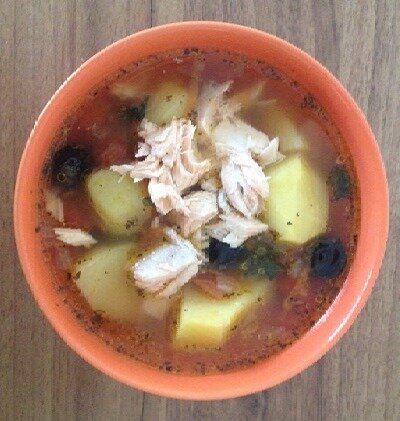 3. С закипевшего бульона снять пену. Добавить перчинки, лавровый лист. Приправить солью. Добавить картофель и варить прибл. 5 минут. Добавить смесь из помидоров, петрушки и базилика и варить до мягкости картофеля. За 2-3 минуты до конца варки в суп можно добавить черные маслины, каперсы, кружочки лимона.