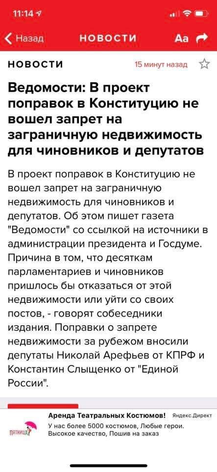 Это просто супер. В новую Конституцию внесли какие угодно поправки, кроме той, о которой говорил президент, а именно, о запрете на заграничную недвижимость для чиновников и депутатов. Вот так вот. Сами депутаты это объяснеят тем, что у многих есть недвижимость за рубежом и в странах СНГ, которая досталась им по наследству, при этом она отражена в обязательных для чиновников декларациях и они не понимает, почему парламентариям нужно отказываться от нее.