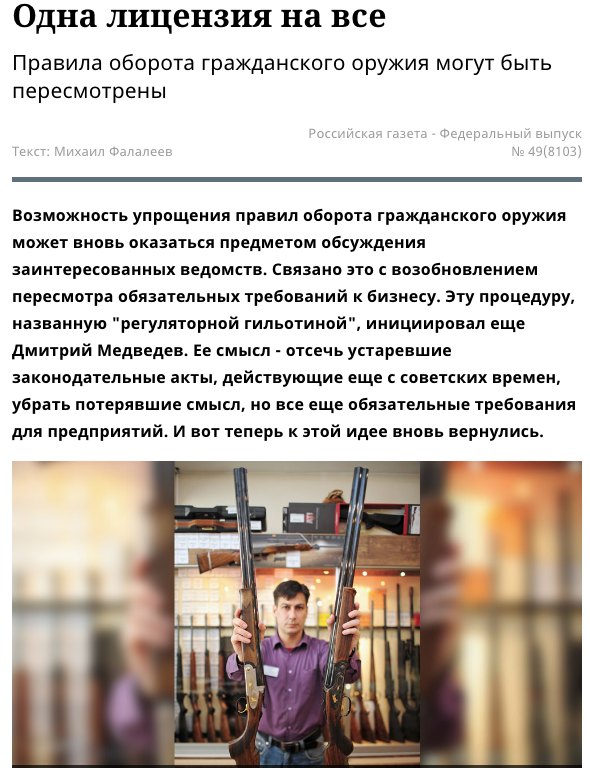 «Так, например, о введении единой лицензии, то есть разрешении на владение оружием. Да, сегодня госпошлина за одну такую пластиковую карточку с фотографией, фамилией, маркой оружия и его номером стоит 2 тысячи рублей. Если у вас 10 стволов, то каждые пять лет придется отдавать 20 тысяч. Дорого. Но какова будет цена единой лицензии? От чего она будет зависеть? Вряд ли останутся все те же 2 тысячи.»