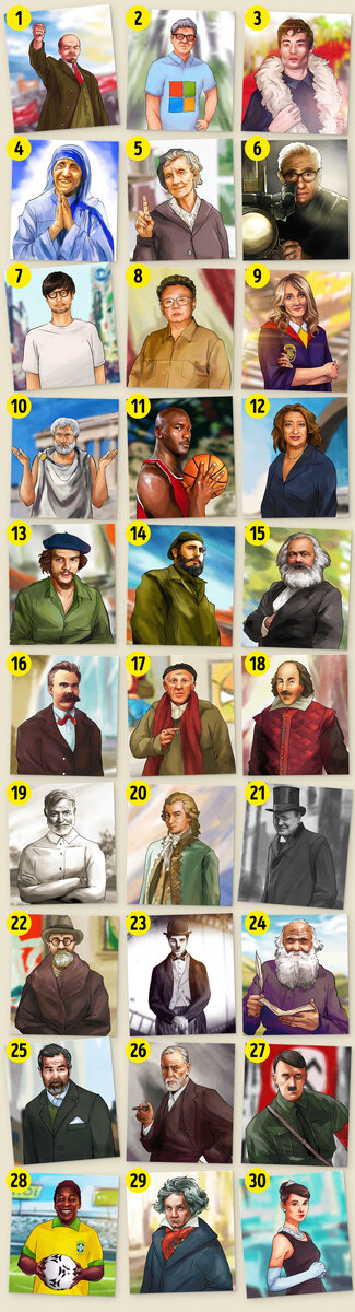 Считается, что знание имен и лиц важных исторических деятелей — показатель эрудиции. Если вы можете угадать по фото или рисунку знаменитость из любой эпохи, вам всегда будет чем блеснуть в компании. Пишите в комментариях сколько людей изображённых на карточках вы угадали, за подсказками в интернет не лезть!