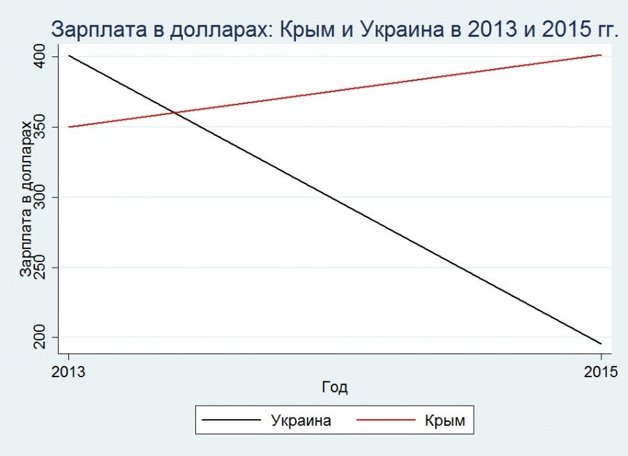 Но одних данных об изменении реальных доходов в Крыму недостаточно. Чтобы выяснить, была ли бы динамика реальных доходов в Крыму лучше, останься он в составе Украины, нужно сравнить эту динамику с аналогичной динамикой по Украине. Иными словами, для ответа на вопрос можно воспользоваться методом разности в разностях, широко используемым в медицинской статистике.
