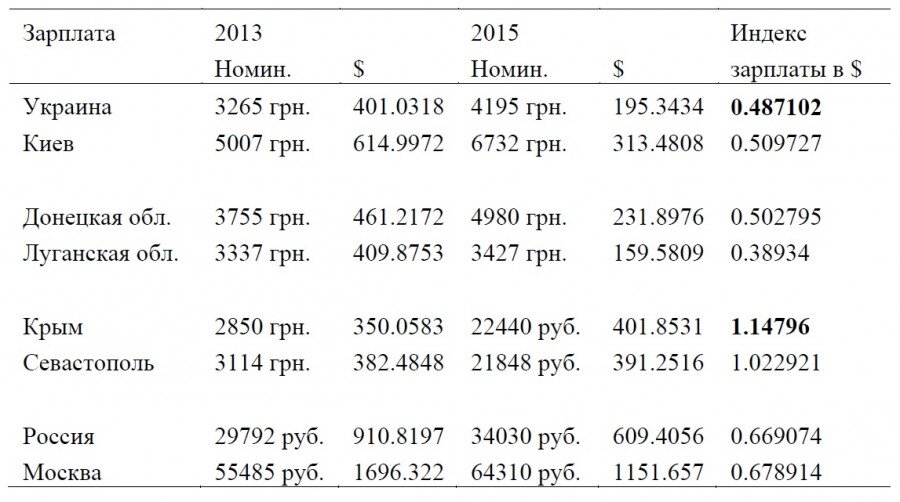 Изменение реальных доходов можно вычислить с помощью данных Росстата и Укрстата. В сборниках "Регионы России" и "Регионы Украины" имеются сведения о номинальной зарплате по регионам этих стран. Номинальная зарплата в обеих странах сильно менялась, поэтому, чтобы оценить изменение реальных доходов, эту зарплату нужно перевести во что-то более стабильное на рассматриваемом отрезке времени. Стандартное решение в таких случаях – перевести в доллары, чтобы оценить динамику доходов в этой валюте. Для этих целей я использовал курсы валют по состоянию на 1 июля 2013 и 2015 гг., взяв данные для гривны и рубля. Затем нужно вычислить динамику зарплаты в долларах для Крыма, Украины, а также (для справки) для России. Соответствующие результаты приведены в таблице ниже.