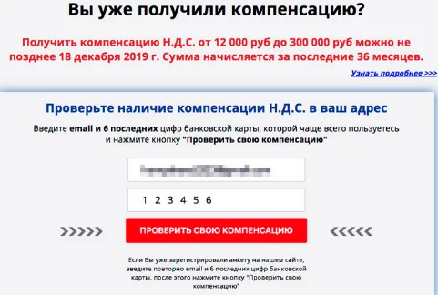 Сегодня я разоблачу мошенников, которые предлагают получить компенсацию в размере от 12 000 до 300 000 рублей за налоги. Очень много, последнее время, таких видео разводов появилось на youtube и других площадках. В них показывают процесс получения денег на их сайте. Как только я зашел по ссылке, оставленной под видео, я увидел следующее: Нужно вбить свою электронную почту и последние шесть цифр банковской карты. И, стоит отметить, есть возможность только сегодня получить деньги, типа завтра уже ни ни. После нажатия на "Проверить компенсацию", идет подключение к каким-то "базам данных" и поиск по этим базам ВНДС. Через минут пять, выясняется, что я могу получить 191 119 рублей налогового вычета. Далее, для того, чтобы получить компенсацию, я должен сначала поговорить с юристом на сайте. Потом она ищет какую-то мою анкету, которую я нигде не оставлял, через минуту пишет: начала оформление компенсации, но требуется от Вас заполнить анкету и дает ссылку на нее. Ну, я заполнил все поддель
