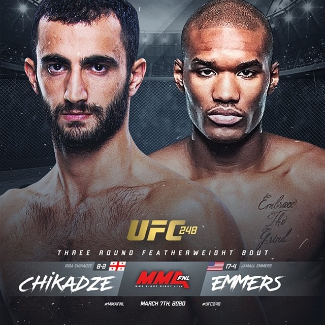 Гига Чикадзе , грузинский боец выиграл три боя подряд, включая его дебют на UFC над Брэндоном Дэвисом в сентябре.На прошлой неделе он должен был выступать UFC Norfolk против Майка Дэвиса однако соперник выбыл с турина что удивительно Мовсар Евлоев тоже не сможет выступить на этом турине к счастью для грузина вышел на замену Джамалл Эммерс.