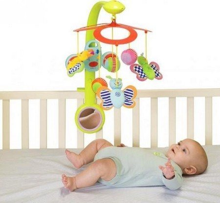 Итак, до месяца малыша будет интересовать только мелодия. Примерно к 2-м месяцам он сможет рассматривать фигурки. Чуть позже, в 3 месяца, ребенок начнет протягивать ручки к интересующим его предметам, тренировать моторику. Вот здесь-то мобиль уже будет использоваться в полную силу.