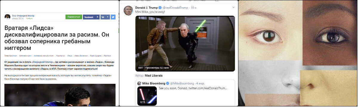 Новость на спортивных ресурсах: «Вратаря английского футбольного клуба «Лидс» Кико Касилью дисквалифицировали за расизм. Он назвал футболиста Джонатана Леко грёбаным ниггером». Таких сомнительных историй становится всё больше в мировом спорте. Но искать в них именно расизм – не просто глупо, но и опасно. Оскорбления всегда основаны на каких-то стереотипах о людях – раса, возраст, рост, вес, особенности внешности и так далее. Дональд Трамп в своем твиттере постоянно унижает своего оппонента Майкла Блумберга из-за роста – а это хейтизм. Их обоих унижают из-за возраста – а это эйджизм. Но тут нет никаких измов, это просто оскорбления. Любые оскорбления плохие. Не нужно выдумывать иерархию оскорблений. Если оскорбление на религиозной или национальной почве – они считаются опаснее и страшнее тех оскорблений, которые основаны на росте или весе. Хотя детский суицид больше происходит из-за вторых вещей, чем из-за первых. Мы видим, как к определённым темам приковывается очень большое и несораз