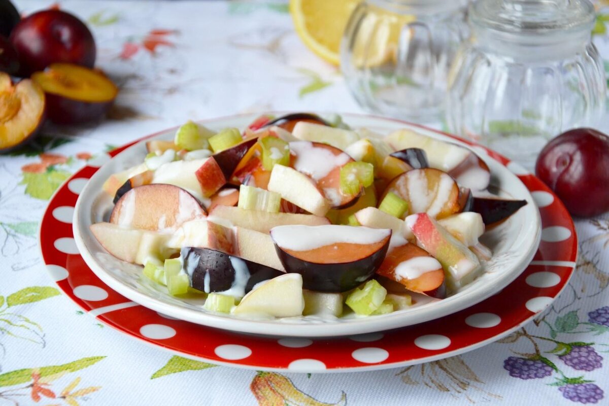 ФРУКТОВЫЙ САЛАТ С ЙОГУРТОМ И СЕЛЬДЕРЕЕМ ИНГРЕДИЕНТЫ НА 1 ПОРЦИИ Сливы 50 гр Стебель сельдерея 1 шт. Яблоки 1 шт. Лимонный сок 1 стол ложка ЗАПРАВКА: Йогурт 25 гр Сахар 1 чайн ложка ПОШАГОВОЕ ПРИГОТОВЛЕНИЕ Шаг 2 Заправка. Соединить йогурт с сахаром. Оставить до полного растворения сахара Шаг 3 Сельдерей нарезать маленькими кусочками. Шаг 4 Сливы разрезать пополам, удалить косточки и нарезать ломтиками. Шаг 5 Яблоки очистить от сердцевины, нарезать небольшими кусочками. Шаг 6 Яблоки, сливы и сельдерей соединить в салатнике, сбрызнуть лимонным соком и перемешать. Заправить фрукты сладким йогуртом и перемешать. Время приготовления: 20 мин