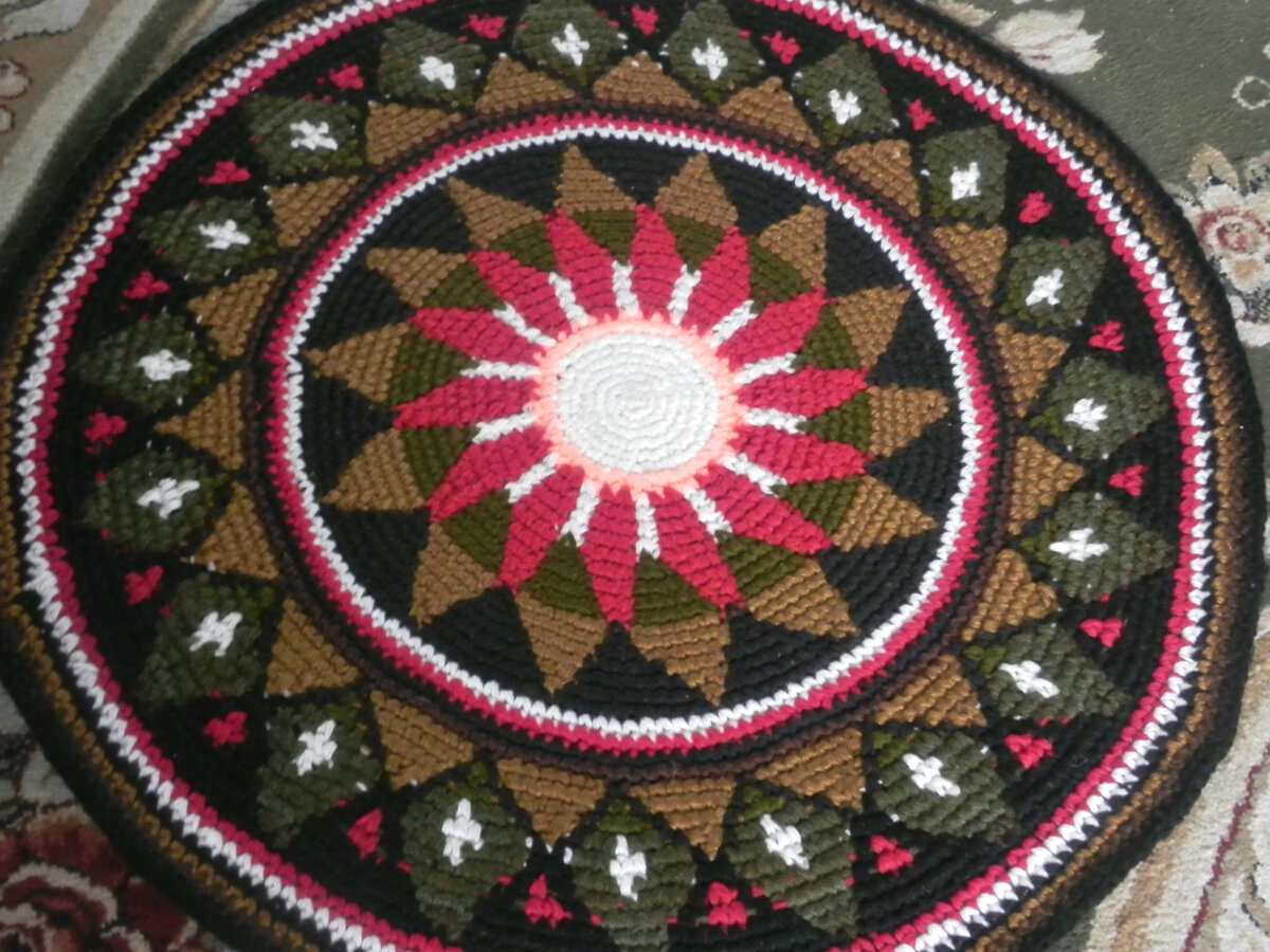 Коврик из пряжи, диаметр 78 -80 см. Не садится, не линяет,стирается в машине, служит долго. Научиться легко, без схемы. Коврик, он и есть сам схема, увеличьте картинку и вяжите по счёту, по цветам. При смене цвета делаем воздушную петлю для увеличения круга. Начинать надо с более простых рисунков, где участвуют 2- 3 цвета .А потом уже можно перейти к сложным. Пробуйте!