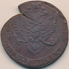 Возникает, когда при чеканке монета застревает в штемпеле, при этом следующую монету штемпель чеканит не своей рабочей поверхностью, а залипшей монетой. Получается монета, одна из сторон которой нормальна, а другая имеет то же изображение, но в негативном (зеркальном) виде.