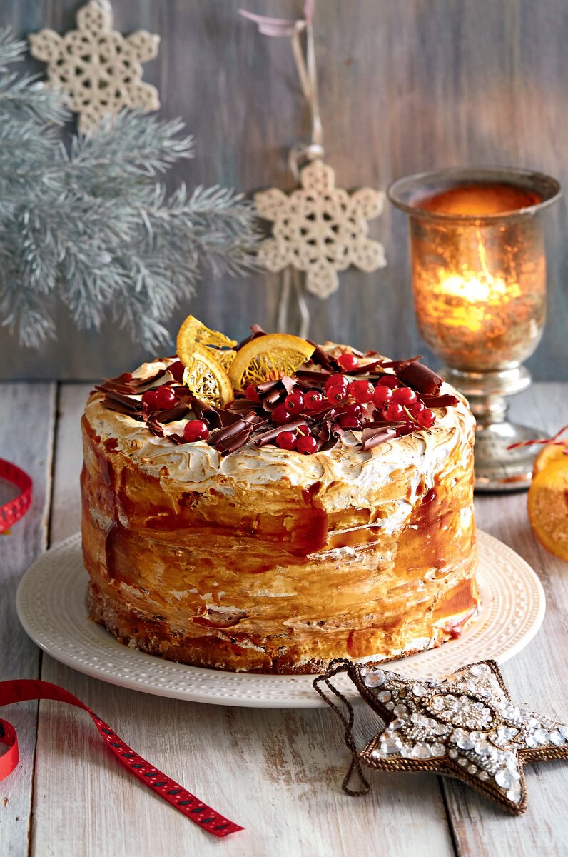 Ингредиенты 6 яиц 300 г мелкого сахара 300 г муки 1 стручок ванили соль свежие ягоды шоколадная стружка чипсы из лимонов Для карамельного соуса: 100 г сахара 100 мл сливок жирностью от 30% 30–40 г сливочного масла Для крема: 500 г сливочного сыра 300 мл сливок жирностью от 30% 150 г сахарной пудры 1 ст. л. порошка какао Для меренги: 2 белка 140 г сахара Для пропитки: 100 мл сахарного сиропа 50 мл рома или коньяка Пошаговый рецепт Шаг 1 Для бисквита взбейте миксером в пышную пену яйца и сахар с семенами ванили. Добавьте просеянную муку с солью, аккуратно перемешайте. Вылейте в круглую разъемную форму (22 см), выстеленную бумагой для выпечки. Выпекайте при 180 °С 20–25 мин. Полностью остудите на решетке. Шаг 2 Для пропитки в сотейнике прогрейте сахарный сироп и стручок ванили, добавьте алкоголь, доведите до кипения и сразу снимите с огня. Полностью остудите, уберите ваниль. Шаг 3 Для крема сливки, взбитые в стойкую пену, смешайте с взбитым с сахарной пудрой и какао сливочным сыро