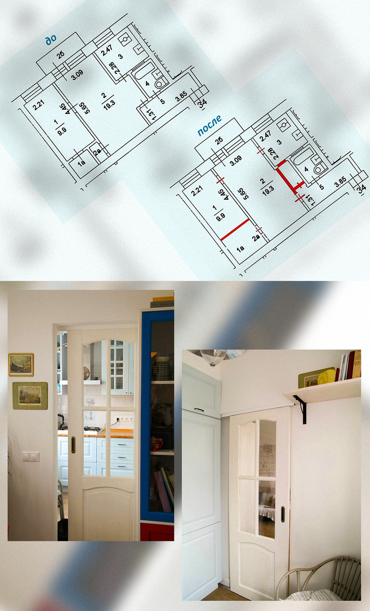 Встроенный шкаф и темную кладовку объединили и расширили за счет второй комнаты, и сделали из нее темную спальню. Слегка сдвинули дверные проемы.