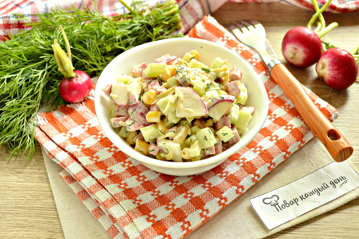 Это другой вариант готовки салата с редиской, в котором она прекрасно соседствует с копченой колбасой, консервированной кукурузой, огурцом, сыром. Для приготовления сытного домашнего салатика с редиской берем ингредиенты по списку в указанном количестве. Для большего числа порций просто увеличьте количество продуктов пропорционально. Начинаем измельчать ингредиенты. Колбасу перекладываем на разделочную доску, нарезаем небольшими кусочками. Перекладываем нарезку в миску. Свежий огурец очищаем от кожуры. Для салата измельчим огурчик в форме мелких кубиков. Перекладываем нарезку из огурца в миску. Займемся теперь редиской. Хорошо ее промываем под проточной водой, срезаем хвостики. Нарезаем редиску полукольцами или четверть кольцами. Добавляем измельченную редиску в миску к остальным ингредиентам. К компонентам салата добавляем сцеженную от сока консервированную кукурузу. Сыр сначала измельчим на терке, а потом дополним им ингредиенты салата. По вкусу солим салат, выкладываем из