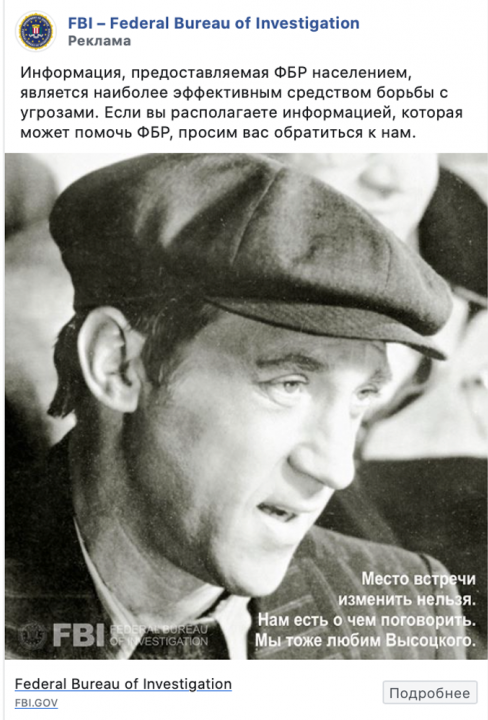 ФБР снова запустило рекламу на русском языке — в этот раз с образом Владимира Высоцкого Американское Федеральное бюро расследований запустило очередную русскоязычную рекламу в социальных сетях. На этот раз ведомством используется фотография советского певца и актера Владимира Высоцкого. Рекламный пост ФБР можно найти на странице бюро в Facebook. Компания ФБР призывает пользователей делиться информаций, которая могла бы помочь в «борьбе с угрозами». К сообщению прикреплено изображение, являющееся кадром из фильма «Место встречи изменить нельзя», в котором Высоцкий сыграл роль капитана Московского уголовного розыска Глеба Жеглова. Сообщение ФБР гласит следующее: «Место встречи изменить нельзя. Нам есть о чем поговорить. Мы тоже любим Высоцкого», а на снимке помимо актера размерен логотип и аббревиатура FBI. Перейдя по ссылке, пользователь попадает на страницу ведомства, где предлагается обратиться в региональное отделение ФБР. Сын Владимира Высоцкого Никита назвал этот поступок г