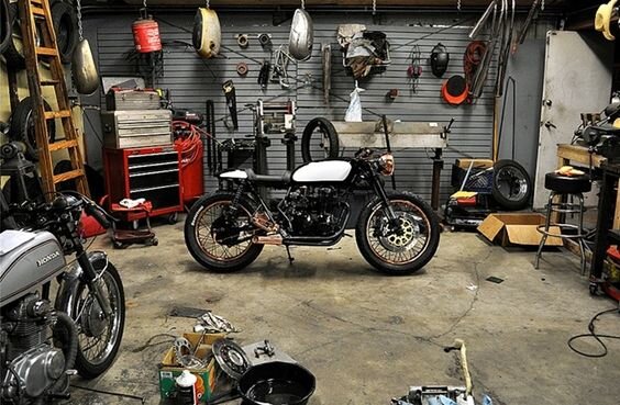 Обычно в гараже целыми рядами выстраиваются полки с маслами, трансмиссионными и моторными. Полезно хранить рядом мерную тару, чтобы понимать, сколько вы заливаете в байк. А так же следует позаботиться о канистре под отработку.