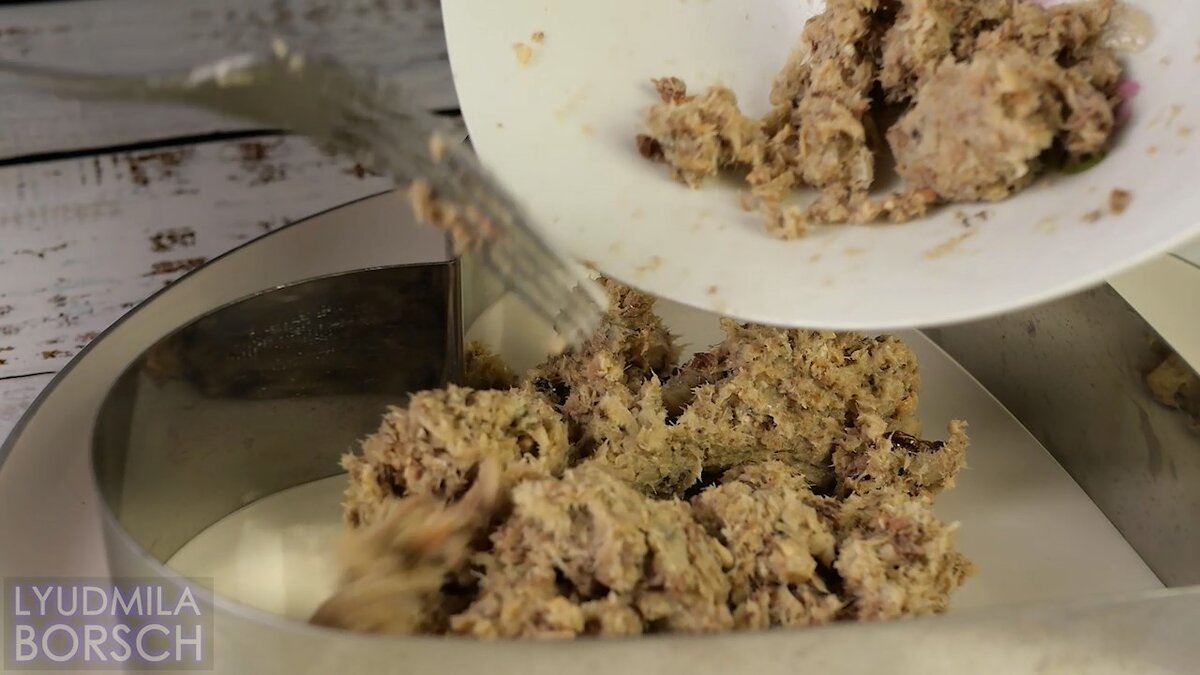 Консервы разомнем вилкой, я взяла сардина в масле, также можно взять тунца...