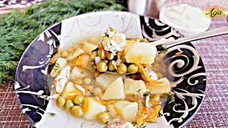Всем привет. Сегодня варю суп с консервированным зеленым горошком. Суп получается вкусным и легким. А сварить его совсем несложно. Ингредиенты: 2 л. куриного бульона; 1 банка (300-400 гр.) зеленого консервированного горошка; 4-5 картофелин; 1 луковица среднего размера, 1 морковь; 2 ст.л.растительного масла; 1/2 пучка укропа; перец горошком; лавровый лист. ЛИСТАЙ≫ В кастрюлю кладём части курицы, заливаем водой и ставим на огонь. Как начнёт закипать снимаем пенку. Затем добавляем небольшую морковку, небольшую луковицу и несколько горошин чёрного перца. Закрываем крышкой и варим на медленном огне до готовности курицы минут 45-50. Пока варится бульон картошку почистим и нарежем небольшими брусочками. ЛИСТАЙ≫ Бульон сварился. Курицу, луковицу и морковь вынимаем из бульона. Опускаем картофель и оставляем вариться до готовности картофеля на минут 15-20. ЛИСТАЙ≫ Пока варится картофель приготовим зажарку для супа. На разогретую сковороду наливаем немного растительного масла, выкладываем