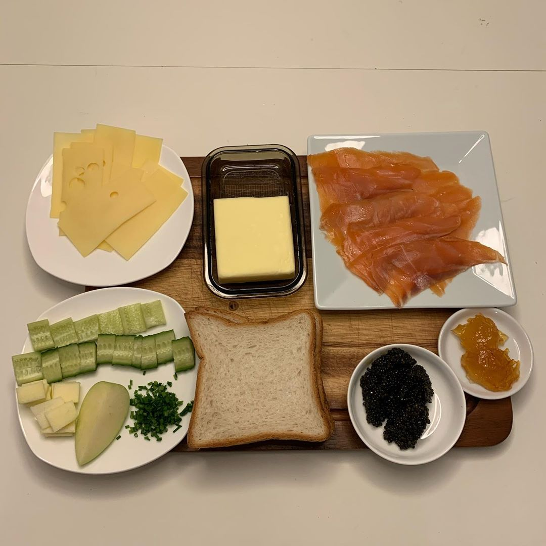 1. Берём квадратный хлеб для тостов, укладываем на него ломтики копченого лосося, затем тонкие пласты «Швейцарского» сыра, щепотку свежего зелёного лука-резанец (chives) и немного лимонного конфи или (что проще) лимонно-апельсинового мармелада (Old English Marmalade).
