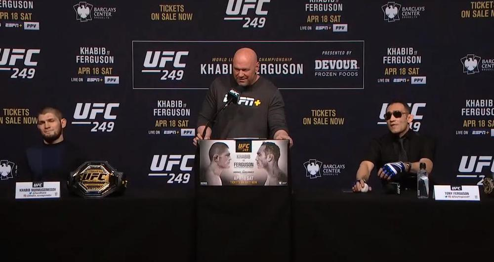 В ночь на 7 марта в Лас-Вегасе (Невада, США) прошла пресс-конференция перед турниром UFC 249 с участием Хабиба Нурмагомедова и Тони Фергюсона. Напомним, 18 апреля дагестанцу будет предстоять провести третью защиту титула чемпиона в легком весе – Тони Фергюсон попробует в пятые раз все-таки выйти на этот бой (предыдущие попытки срывались из-за травм спортсменов). Тони Фергюсон вышел на пресс-концеренцию с поясом временного чемпиона старого образца, которым он ранее владел. Пояс – действующий, нового образца – ждал Нурмагомедова на его месте. Предлагаем избранные цитаты. Тони Фергюсон: Хайп настоящий вокруг этого боя. И этот пояс настоящий. Пришло время для шоу, ребята. Хабиб, лучше тебе не пропустить этот бой.