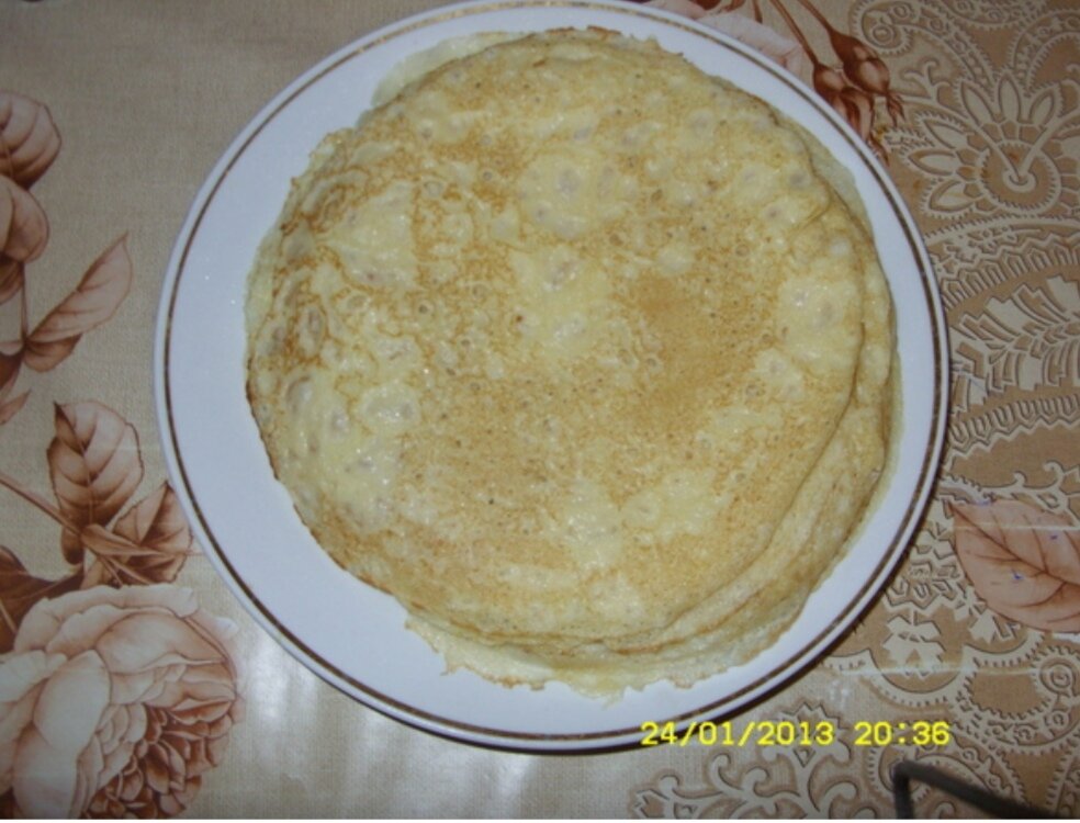 ингредиенты: Приготовление : В глубокую миску налить воды, добавить сухую детскую смесь и тщательно перемешать венчиком. Добавить яйца, соль и сахар и снова перемешать. Добавить муку (добавлять постепенно, по 1-2 столовых ложки) и перемешать. Тесто по консистенции должно напоминать жидкую сметану. Дать ему настояться около получаса. Затем добавить растительное масло и перемешать. Выпекать блины на разогретой сковороде. Готовые блины смазать сливочным маслом. Приятного аппетита.