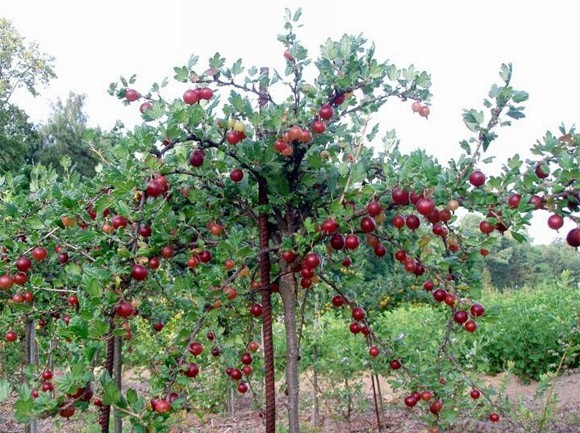 Острые длинные колючки, мешающие собирать плоды и ухаживать за кустом, расположенные у самой земли ветви, на которых загрязняются ягоды, плохое проветривание куста, приводящее к возникновению грибковых заболеваний. Со всеми этими явлениями мы сталкиваемся, если выращиваем крыжовник в виде куста. Многие садоводы уже отошли от этой традиции и выращивают крыжовник в штамбовой культуре. Такие «деревца» не только дают хороший урожай крупных, яркоокрашенных ягод, но и делают сад более привлекательным. Выбираем способ получения штамбового крыжовника Штамбовый крыжовник можно получить двумя способами — вырастить его из корнесобственного саженца или привить на золотистую смородину. 1. При использовании корнесобственных саженцев поступают следующим образом. Через год после посадки в кусте оставляют один пряморослый сильный побег, остальные вырезают на уровне почвы. Еще через год все боковые веточки до высоты 60 см удаляют, создавая таким образом штамб. Вверху этого штамба оставляют 4-