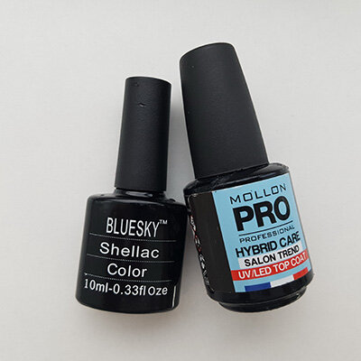 На цветное покрытие наносим тонкий слой топа MollonPRO и сушим в лампе 10 секунд.