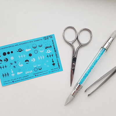 Дизайн, отделенный от подложки, кладем на липкий слой топа. Силиконовой кистью (можно использовать апельсиновую палочку) разглаживаем дизайн на поверхности, прижимаем к материалу и сушим в лампе еще 20 секунд.