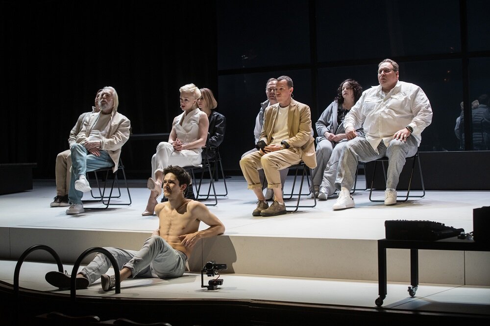 Первое действие пьесы будто продолжает ту расслабленную обстановку, которая была заложена актерами перед началом спектакля, только все они стали героями пьесы, причем, не сильно изменившись психологически. Пока все собираются уже для того, чтобы смотреть постановку Константина, разговор о театре продолжается, и текст Чехова переплетается с текстом об актерах, зарплате и актерской естественности. Театральным стебом начинается спектакль, и планка театрального стеба продержится всё первое действие, доводя зрителей чуть ли не до нервного хохота. Герои Чехова посмеются над иммерсивным театром, выдержат трехминутную паузу перед зрителями, и даже устроят дискотеку, без которой в современных постановках практически не обходится ни один спектакль Юрия Бутусова (кстати, замеченного тоже в зале среди зрителей). А потом выйдет Нина в инопланетном металлическом костюме и прочтет знаменитый чеховский монолог «Львы, орлы и куропатки». Режиссеру оказалось мало текста Чехова, чтобы обозначить отношения Аркадиной и Треплева, и они периодически общаются словами Гертруды и Гамлета: мать и сын, что у Чехова, что у Шекспира были слишком дорогими и в тоже время слишком далекими людьми. И как у Шекспира театр меняет жизни людей, так и у Чехова он их поменял. Это все сделано так вкусно, что после спектакля Константина Треплева, который разбивает жизни всех героев на «до» и «после», уже покажется, что и ты, будучи зрителем, разделен на это до и после. Театр может перевернуть любую, как актерскую, так и зрительскую судьбу. Озеро в постановке и на сцене, и озером же является зал, в озеро-зал периодически «ныряют» и актеры, убирая «четвертую стену».