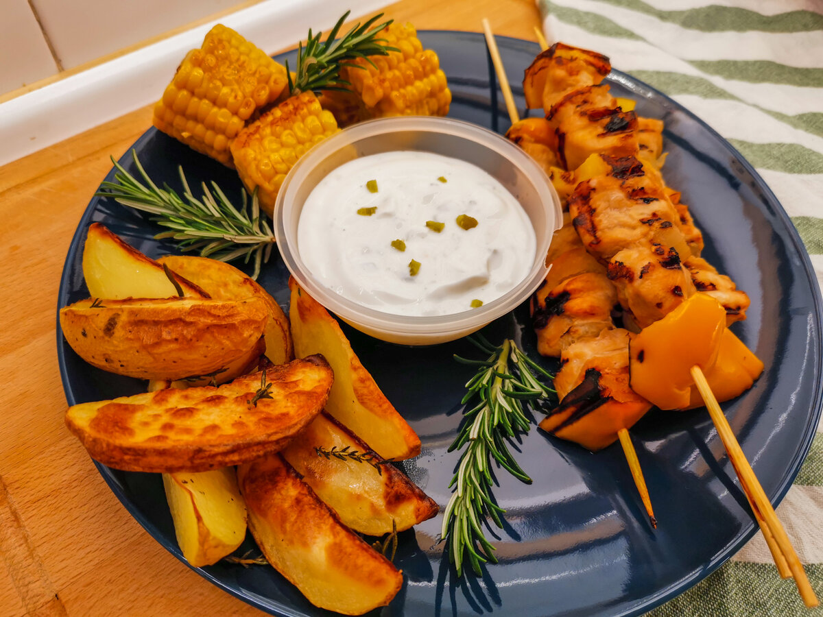 Пока картофель запекается, приготовим "принцесс" этого блюда - шашлычки. Я расскажу вам о ТРЕХ способах приготовления. Шашлычки получаются сочными и вкусными! Приступим! Из ингридиентов необходимо (на 6 шашлычков): Приготовим маринад. В емкости смешиваем соевый соус, мёд, оливковое масло и выдавленный зубчик чеснока. Я случайно увидела, что взяла сладкий соевый соус, поэтому мёд не добавляла. Филе индейки нарезаем на кубики, приерно 2х2 см и отправляем в маринад. Перемешиваем, чтобы каждый кусочек пропитался. А пока готовим овощи - кубиками нарезаем болгарский перец и лук. ШПАЖКИ. Тут есть нюанс - если шашлычки будете готовить в духовке, то шпажки ЗАМАЧИВАЕМ В ВОДЕ. Если нет, то не надо. Начиняем шашлык - на шпажку насаживаем перец, затем кусочек мяса, лук, мясо, перец, мясо, лук, мясо, перец. И так на все шпажки. И тут есть 3 варианта приготовления шашлычков: 1. В духовке. Шашлычки нужно поместить над емкостью, как на фото ниже, и отправить в духовку на 15-20 мин до готовности. 2. Н