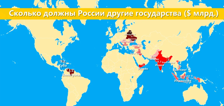 Не менее 17 стран являются должниками России. Их суммарные обязательства перед Москвой — $27 млрд. Больше всего денег взяли не вернули Белоруссия, Украина, Венесуэла, Куба. Ранее Россия уже списала более $30 млрд и продолжает, прежде всего по политическим мотивам, финансировать своих партнеров