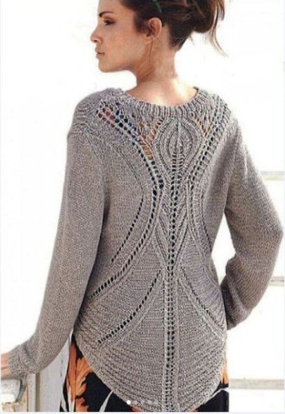 Шикарный вязаный пуловер с V-образным вырезом скрывает в себе загадку, так как спереди все просто и лаконично, а вот сзади открывается приятная неожиданность - чудный ажурный узор. Вы будете в восторге от этой модели!