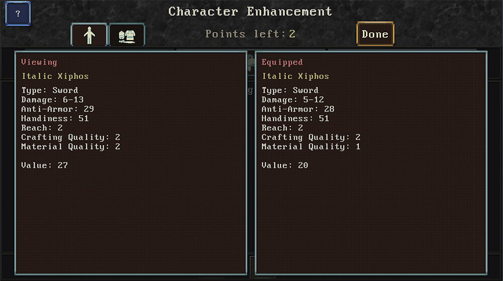 Например, на этом сравнении видим, что предлагаемый меч ксифос италийского типа за 9 денариев, имеет чуть лучшие характеристики (наносимый урон, способность пробивать броню и качество материала), чем мой меч аналогичного типа, выданный при поступлении на службу.