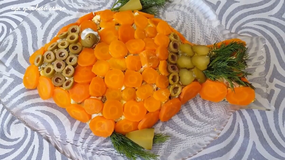 Всех приветствую на своем канале!!! Поздравляю с прекрасным весенним праздником моих читательниц и желаю всем женщинам, девушкам, девочкам быть любимыми. Мужчинам тоже большой вечерний привет)))) Завтра... хотя нет, почти уже сегодня 8 марта, так как у меня "на дворе" 23.30, и я села за компьютер, чтобы поделиться с вами вкусным, сытным салатом, который назвала "Золотая Рыбка" и который готовила сегодня. Честно сказать, я не знаю есть такой салат в природе или нет, вот именно из тех ингредиентов, которые использовала я. Если знаете его название, то поделитесь в комментариях. Для салата я взяла копченую кету 150 грамм 3 яйца 3 небольших картофелины, сваренных в мундире 1 маленькая луковица и зеленый лук 6 маринованных корнишонов (можно заменить на маринованные огурцы или соленые) для украшения 3 отварных морковки оливки укроп для заправки смесь приправ 1 ч.л. немного соли 2 ч.л. горчицы 4 ст.л. майонеза Картофель, морковь и яйца я отварила до готовности, после овощи почистила от ко