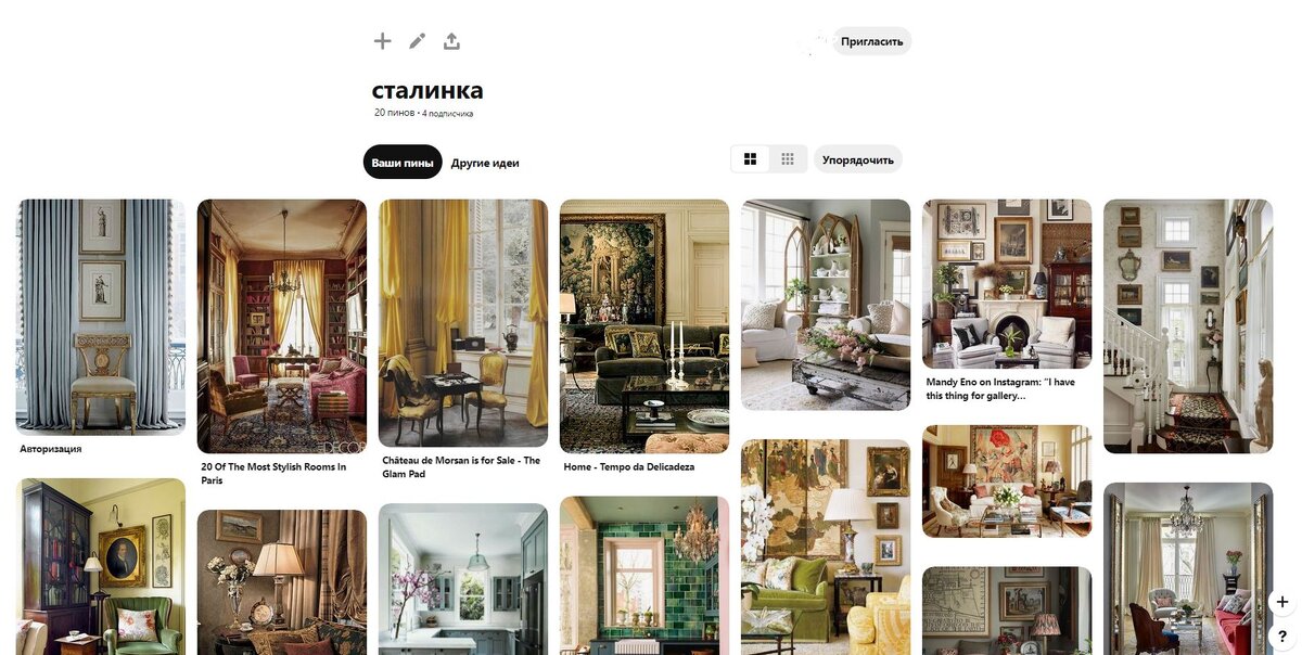 В прошлой статье я описывала, как важно до начала работы над дизайном квартиры подобрать аналоги. Где же их найти? Гугл и яндекс - варианты не самые лучше и ниже я объясню почему. Существует намного более удобный для этих целей Пинтерест. Как он мне поможет? На пинтересте вы сможете подобрать аналоги под любое ваше пожелание. Классические бежевые интерьеры, прохладное сканди, черный минимализм. Понравившиеся картинки вы можете "приколоть" на собственную тематическую доску, чтобы не потерять. Ссылку на "доску" можно отправить друзьям, дав возможность посмотреть или тоже добавить идей. Вот так, например, выглядит доска аналогов для моей квартиры. Почему бы просто не поискать в Гугле или Яндексе? Пинтерест подбирает картинки со вкусом. Не знаю как, видимо чудом. Ниже я привела пример: один и тот же запрос в яндекс и пинтерест. Сравните насколько отличаются результаты. Конечно, любители кислотных цветов и на пинтересте смогут найти аналоги, но все же шанс нарваться на безвкусны