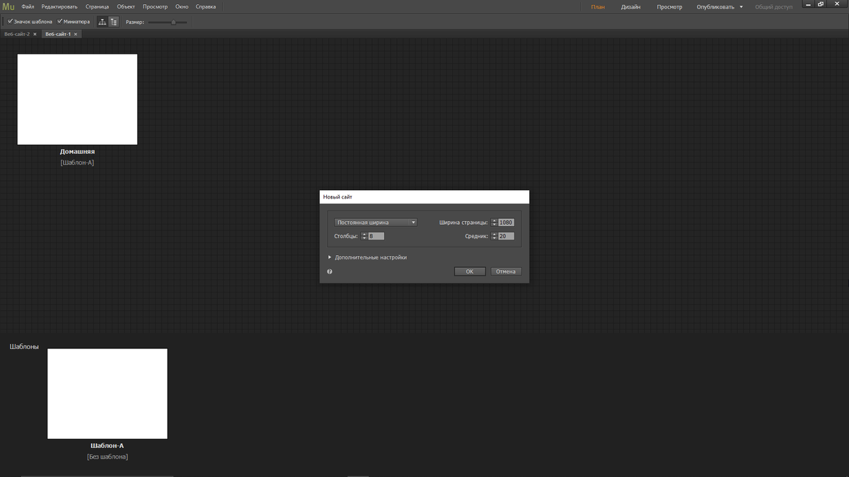 Если вы читаете это, то вероятнее всего вы только начинаете своё знакомство с Adobe muse. В этой статье я расскажу вам как создать сайт в Adobe muse. Прошу обратить внимание на то, что в этом гайде я не буду учить вас дизайну, а лишь научу пользоваться базовым инструментарием Adobe muse. Для начала вам нужно перейти во вкладку "файл", что находится в левом верхнем углу программы. Далее выбираем "новый сайт" ставим постоянную ширину, макс. ширину страницы 1080, 8 столбцов и средник 20. В конечном итоге должно выйти вот так: Ширина в 1080 пикселей нам понадобится для того, что бы создать "резиновый" сайт. Далее перейдём на домашнюю страницу. После создания сайта вас должно перекинуть на вкладку "План". Здесь вы можете увидеть "Домашнюю страницу" и шаблоны страниц. Давайте перейдём на домашнюю и рассмотрим инструменты. 1. Инструмент "выделение". Как понятно из названия, этот инструмент