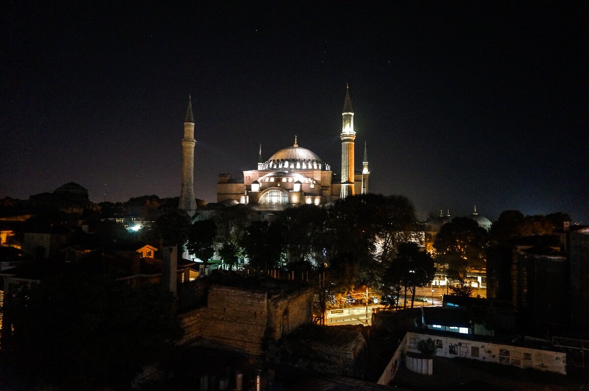 Святая София и три времени ее суток. Мы удачно заселились в первый отель. И сразу с хорошим видом из окошка) Кстати, отели на негалатской стороне Стамбула очень недорогие.