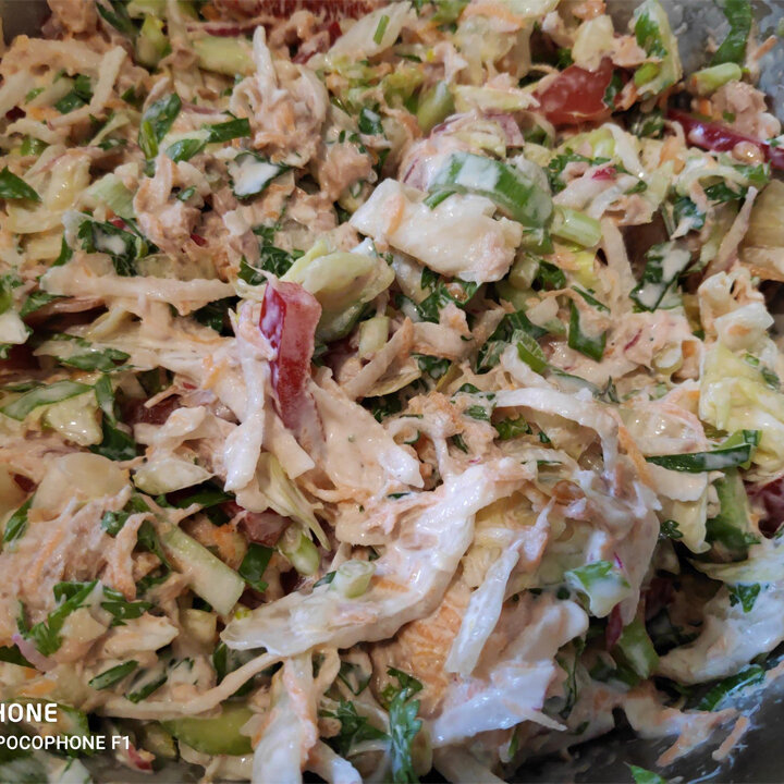 майонез - 680. Но мы используем одну-две столовые ложки, то есть 20-30 грамм, что даёт не более 200 ккал. Нужно принять во внимание, что 100 грамм тунца и 30 грамм майонеза идут на миску салата - у меня получается четыре порции.