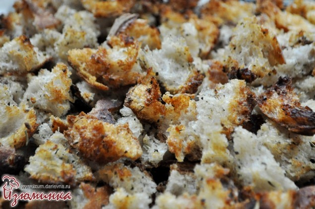 Крутоны - это простое изобретение неплохо разукрашивает повседневную кухню, придает блюдам "изюминку" и вообще нередко облегчает жизнь. Чем? Ну, во-первых, крутоны - это вкусно. Когда прибегаешь с работы и хочешь что-то просто быстренько перекусить, особо не забивая желудок, можно сгрызть пару кусочков, при этом вроде как и голод утихомирить, но и аппетит не перебить. Во-вторых, это прекрасное дополнение к салатам, благодаря которым можно даже обычный рядовой овощной салат превратить во что-то умопомрачительное. В-третьих, как ни странно это звучит, но крутоны зачастую - это отличный способ утилизировать хлеб, который иногда в избыточном количестве возникает в доме. Как приготовить крутоны? Ингредиенты: 1 свежий батон; 4-5 зубчиков чеснока; 1 ст. л. любимых сухих трав (у меня - прованские); 1 ч. л. паприки; 5-7 ст. л. растительного масла (идеально - оливкового, но и подсолнечное тоже подходит); соль, черный перец по вкусу, сухой перец чили - опционально; 5-7 ст. л. воды. Инструкция П