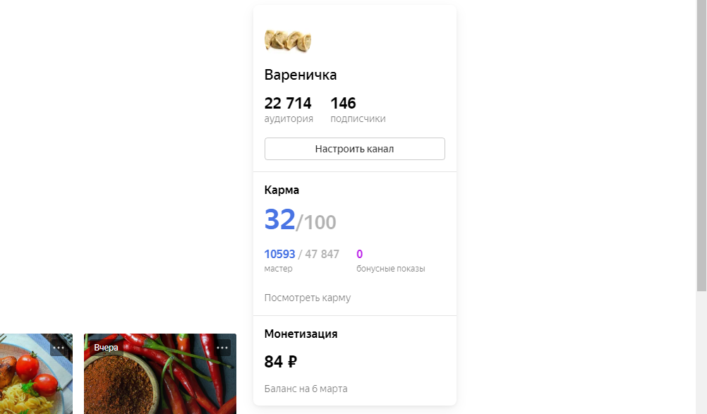 Писать статьи я начала еще 2 года назад. Никак не могла выйти на монетизацию и забросила это дело. Вернулась на дзен в этом году в конце января, спустя три недели , вышла на монетизацию. И заработала почти 100 рублей за 4 дня монетизации. Мой канал о еде, рецептах, и продуктах. По сути я переписываю уже готовые рецепты и статьи на более простой и доступный язык. Беру информации из различных источников: книги, интернет ресурсы, инстаграмм. Аудитория канала почти 25 тысяч. Дочитываний почти 35 тысяч. Канал называется Вареничка. Название придумал муж) Очень хорошо на канале заходят статьи про продукты обладающие какими- то свойствами. Что- то типа Продукты от запора. Продукты понижающие давление. Почему начала писать про еду? Потому что все мы едим и это неотъемлемая часть нашей жизни. Мы всегда ели и будем есть, поэтому данная тематика никогда не устареет и будет актуальна в любое время года. Подписывайтесь на оба моих канала, буду делиться своими успехами и радовать вас рецептами.