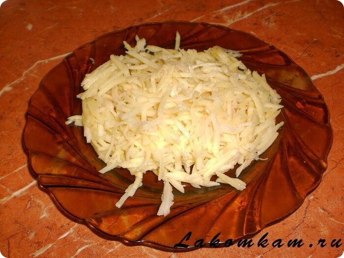 Приготовление жульена с картошкой и грибами. Очищенный картофель трём на тёрке.