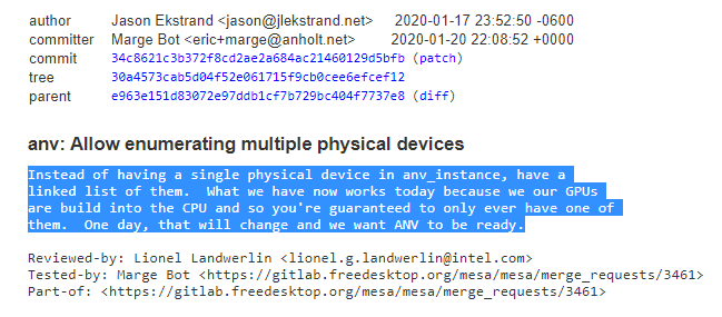 Intel начала этот год с умеренных откровений в отношении своей дискретной графики, но мы хотя бы можем быть уверены, что разработчики начинают получать от корпорации образцы дискретных решений серии DG1. Теперь ресурс Phoronix сообщает, что в коде драйверов Vulkan для Linux появились упоминания о намерениях Intel внедрить поддержку многопроцессорных графических конфигураций. Источник изображения: Freedesktop Автор обновления резонно отмечает, что сейчас графическое решение Intel может присутствовать в каждой системе только в одном экземпляре, но скоро всё изменится, и к тому моменту нужно подготовить программную экосистему. По крайней мере, встроенная графика Intel сможет соседствовать с дискретной. Кроме того, ускоритель вычислений Ponte Vecchio на базе 7-нм графических процессоров класса Intel Xe тоже получит многокристальную компоновку. Конечно, в потребительских системах он эксплуатироваться не будет, но нужно начинать подготовку программного обеспечения заблаговременно.