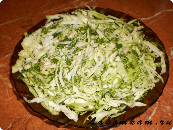 Ингредиенты: белокочанная капуста — 600 грамм; чеснок — 2 зубчика; сок лимона — половина 1 штуки; укроп — половина пучка; соль — 3 чайные ложки; сахар — 2 чайные ложки; растительное масло — 2 столовые ложки.