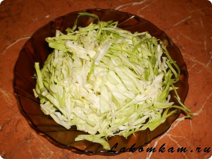 Приготовление капусты по-старорусски. Капусту тонко шинкуем и поливаем соком лимона.