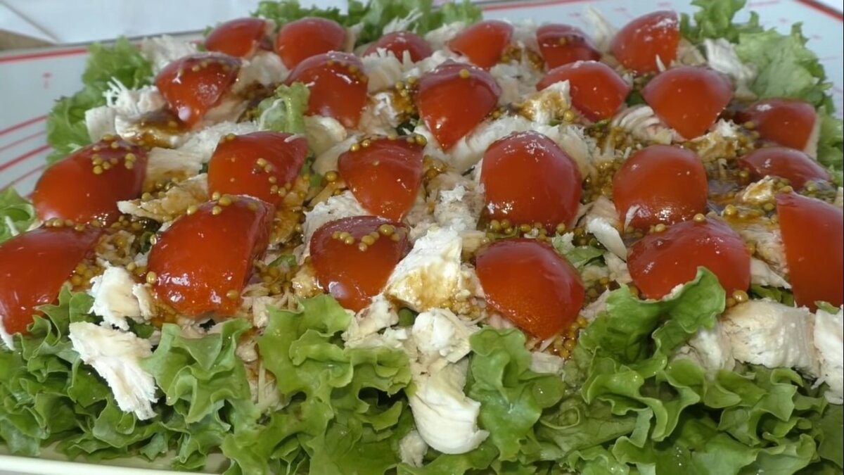 Вот такой легкий и сочный салат без майонеза. Яркий и витаминный. Приготовить такой вкусный салат с салатом и курицей просто. А получается очень вкусно! Изюминкой данного рецепта является соус, который придает этому салату аромат и невероятный вкус. Горчица и кунжут дополняют все это легкой нотой пряности. На самом деле вкусно! Подходит как салат на праздничный стол или на каждый день. Ингредиенты: соль - по вкусу. Как приготовить: Помытый салат порвать на кусочки и выложить на большую тарелку. Отварное куриное филе порезать, выложить на салат. Помидоры черри порезать и вынуть серединки. Выложить помидоры на куриное филе. Посолить. Соус. Смешать "Французскую" горчицу в зернах, соевый соус, оливковое масло и лимонный сок и перемешать до однородности. Равномерно полить салат соусом. В завершение посыпать семенами кунжута. Дать настояться 30-60 минут. Приятного аппетита! Кому понравилось, подписывайтесь на канал, ставьте лайки, пишите комментарии. Буду рад любой критике, а может